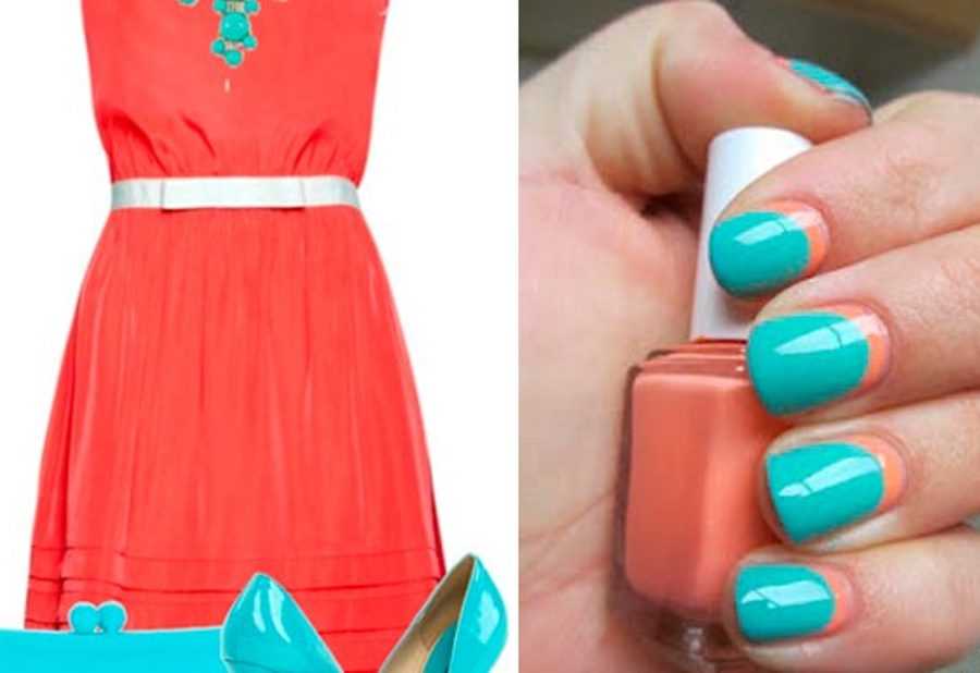 Если вы хотите выглядеть женственно в коралловом платье, выбирайте для маникюра бирюзовые оттенки. Этот нежный и оригинальный цвет сделает ваши ногти необычайно красивыми и дополнит очарование кораллового платья. Его можно дополнить небольшим количеством блесток, но ни в коем случае ни страз – так дизайн ногтей под коралловое платье будет смотреться слишком тяжело.