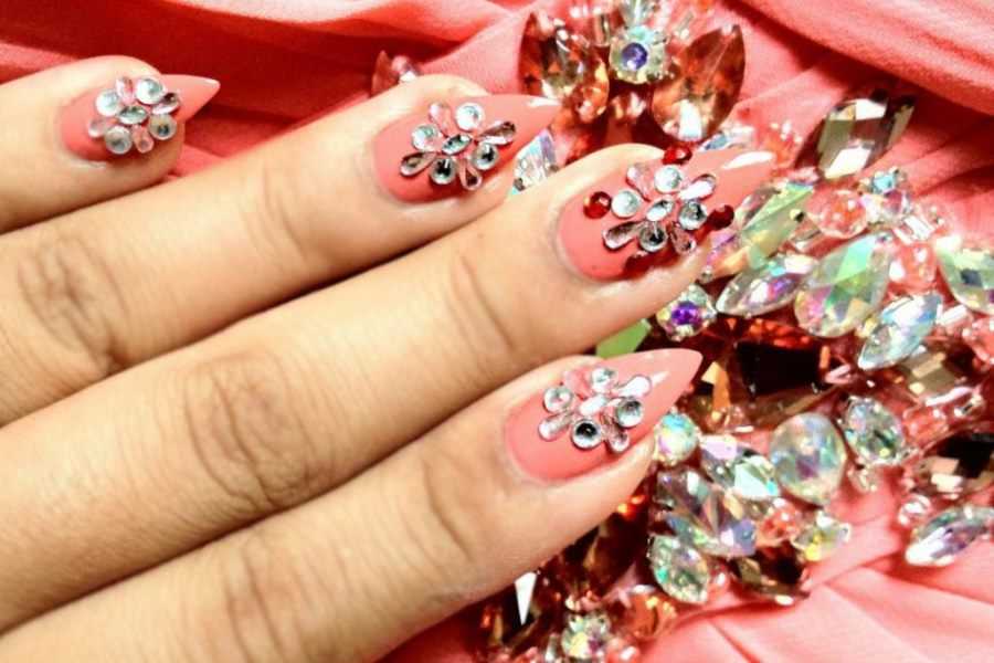 Для вечернего выхода в свет наряду с яркими лаками для ногтей можно использовать блестки и стразы. Такой вариант будет красиво смотреться с однотонным, но стильным по фасону коралловым платьем.