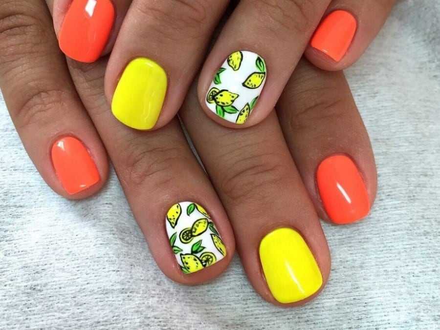 Можно также попробовать маникюр в желтых оттенках. Сочетание желтого и кораллового цвета довольно необычное, но они дополняют друг друга, поэтому вы можете смело выбирать такой маникюр под коралловое платье.