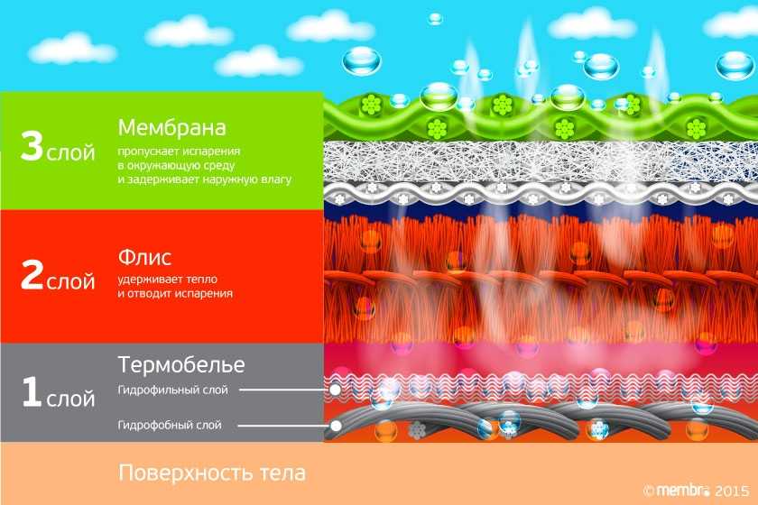 Мембранная куртка защищает от дождя и мокрого снега, но, в отличие от резины или полиэтилена, дышит: мембранный слой подхватывает влагу, прошедшую от тела сквозь термобелье и флис, и отводит ее в окружающую среду. В зависимости от типа мембраны — порового или беспорового — способы транспортировки будут отличаться.
