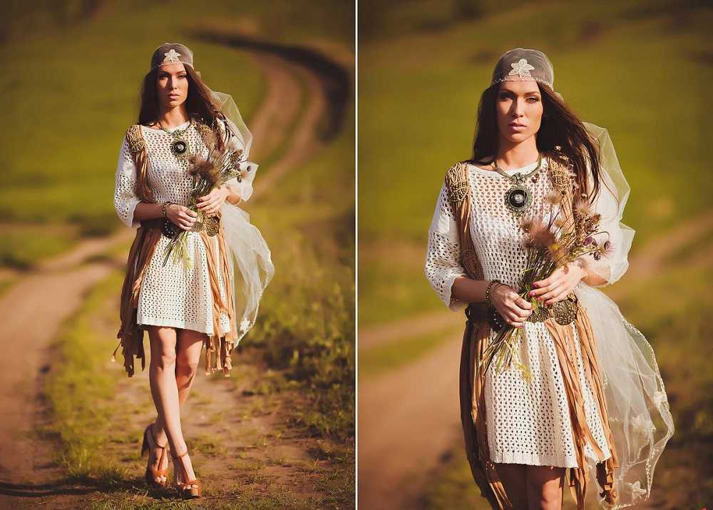 Создавайте максимально естественный образ. Для платья подойдут натуральные ткани: шифон, лен, шелк, мешковина, отлично будут смотреться вставки из кожи или меха, кружево, геометрические узоры или этнические мотивы в индейском стиле. Вы не ограничены в цветах. Можете сделать выбор в пользу традиционной гаммы (белый, кремовый, бежевый), а можете поэкспериментировать и выбрать более яркий и сочный тон (оранжевый, бирюзовый, изумрудный). Длина юбки и рукавов также зависит от вас.