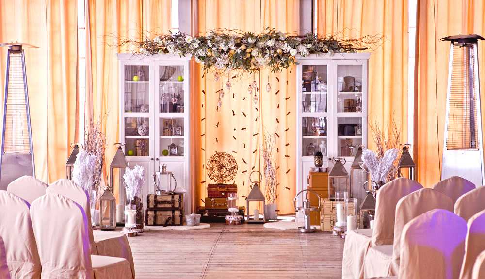 Для украшения помещения, где будет проходить свадебный банкет, можно использовать особые вещи интерьера – состаренную мебель, текстильные скатерти изо льна помогут создать особое настроение на празднике. Проведение торжества на свежем воздухе открывает больше возможностей для оформления. Очаровательно будет смотреться арка из живых цветов, которая отлично подойдет для проведения выездной церемонии, фотосессии, кроме того любые цветочные композиции станут истинным украшением торжества.