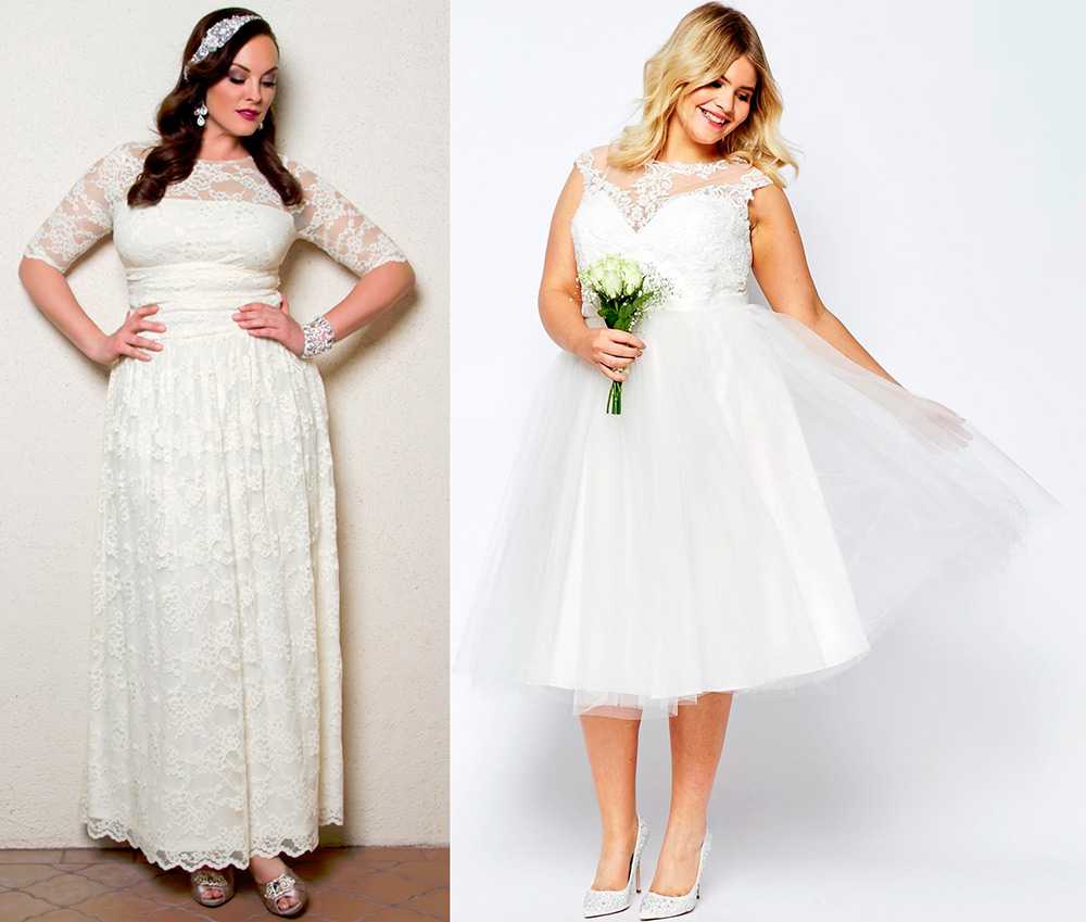 Полные невесты с красивыми ножками могут смело надевать короткое свадебное платье. Однако слишком укорачивать юбки не нужно, достаточно длины до икр или колена.