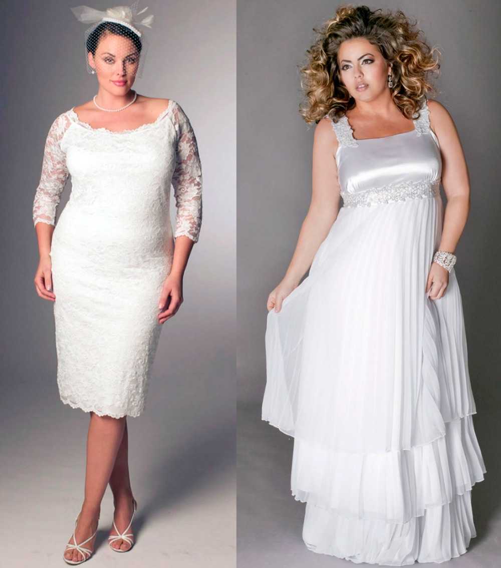 Короткий свадебный наряд в виде трапеции отлично преподнесёт красивый бюст, уменьшит талию, отвлечёт внимание от лишних килограммов на попе. Подходящие модели свадебных платьев для полных девушек — на фото ниже:. Прямой силуэт короткого наряда в виде футляра удлинит фигуру, перенося акценты пропорционально