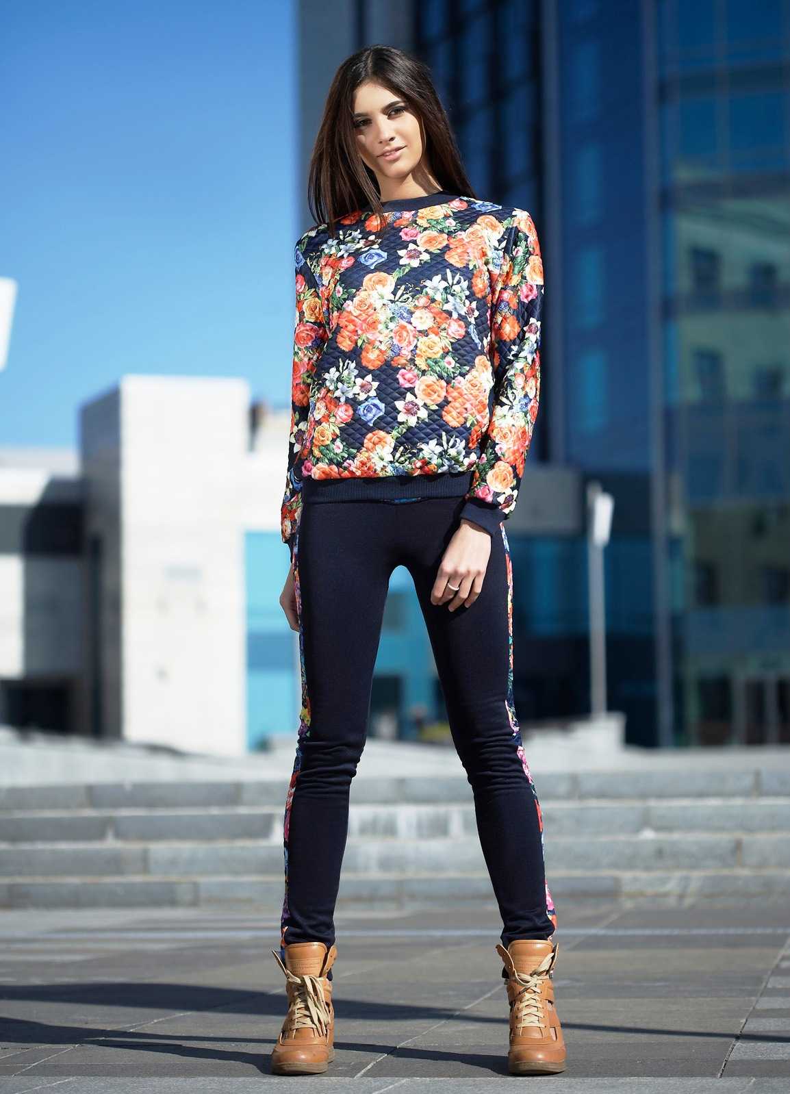 - Свитшот, имеющий цветочный принт, хорошо гармонирует с брюками skinny. Низ лучше оставить однотонным, а обувь выбрать в стиле балеток, ботинок, мокасин.
