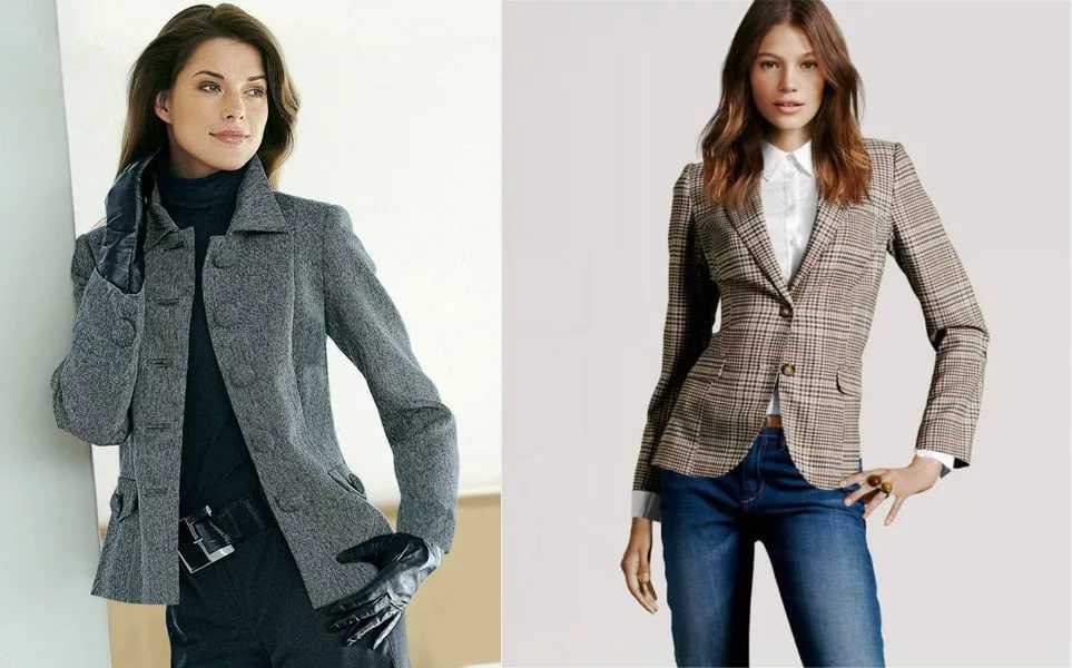 Обладательницы фигуры «песочные часы» могут смело носить приталенные образцы, в меру облегающие силуэт. Для прямоугольного телосложения (неявно выраженная талия) подойдут свободные пиджаки на пуговицах длиной до середин бедер. Это может быть образец в стиле Шанель, добавляющий элегантность и роскошь внешнему облику.