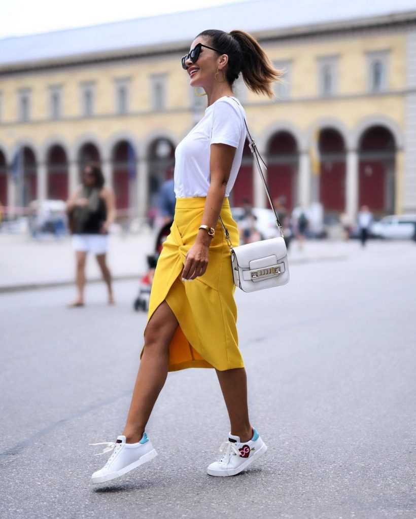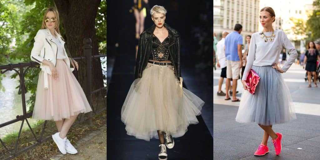 Модный образ может состоять из юбки любой длины и кроссовок любого фасона и цвета, но есть несколько самых эффектных сочетаний.