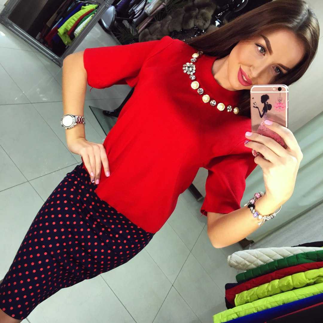 Красная юбка сегодня востребована. Для экстравагантной личности подойдет неординарный вариант – красный фон юбки с черным гороховым рисунком. Данный фасон смел и уникален. Ажурный белый верх задаст радостный настрой на целый день.