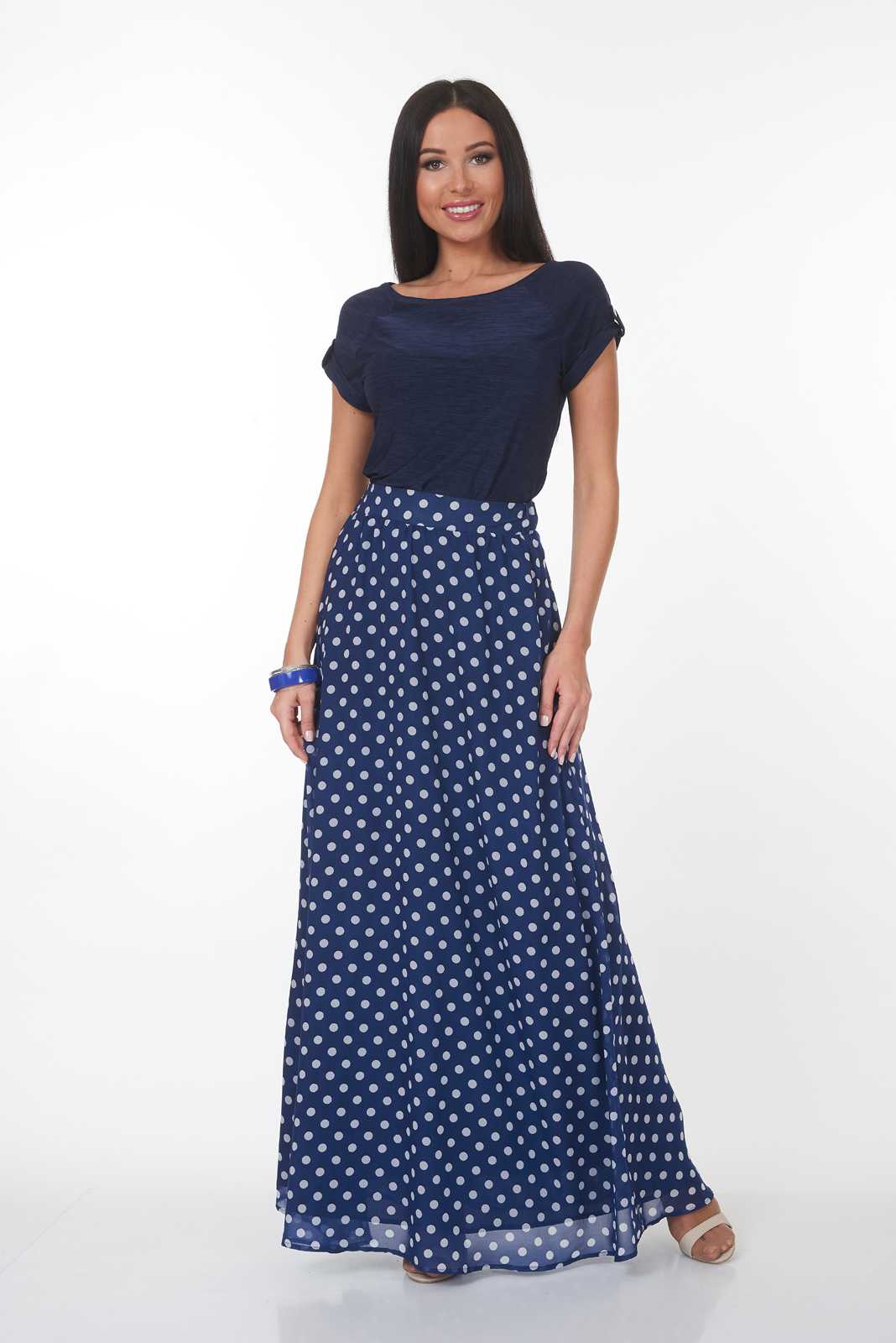 Темно-синяя юбка в мелкий горошек может использоваться для вечернего туалета, если дополнить ее пастельной или белоснежной блузкой с вырезом и босоножками или туфельками на шпильке. Подчеркнуть ансамбль помогут яркие браслеты, кулоны, серьги.