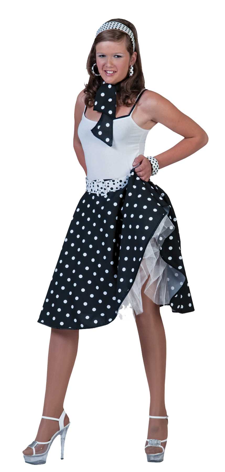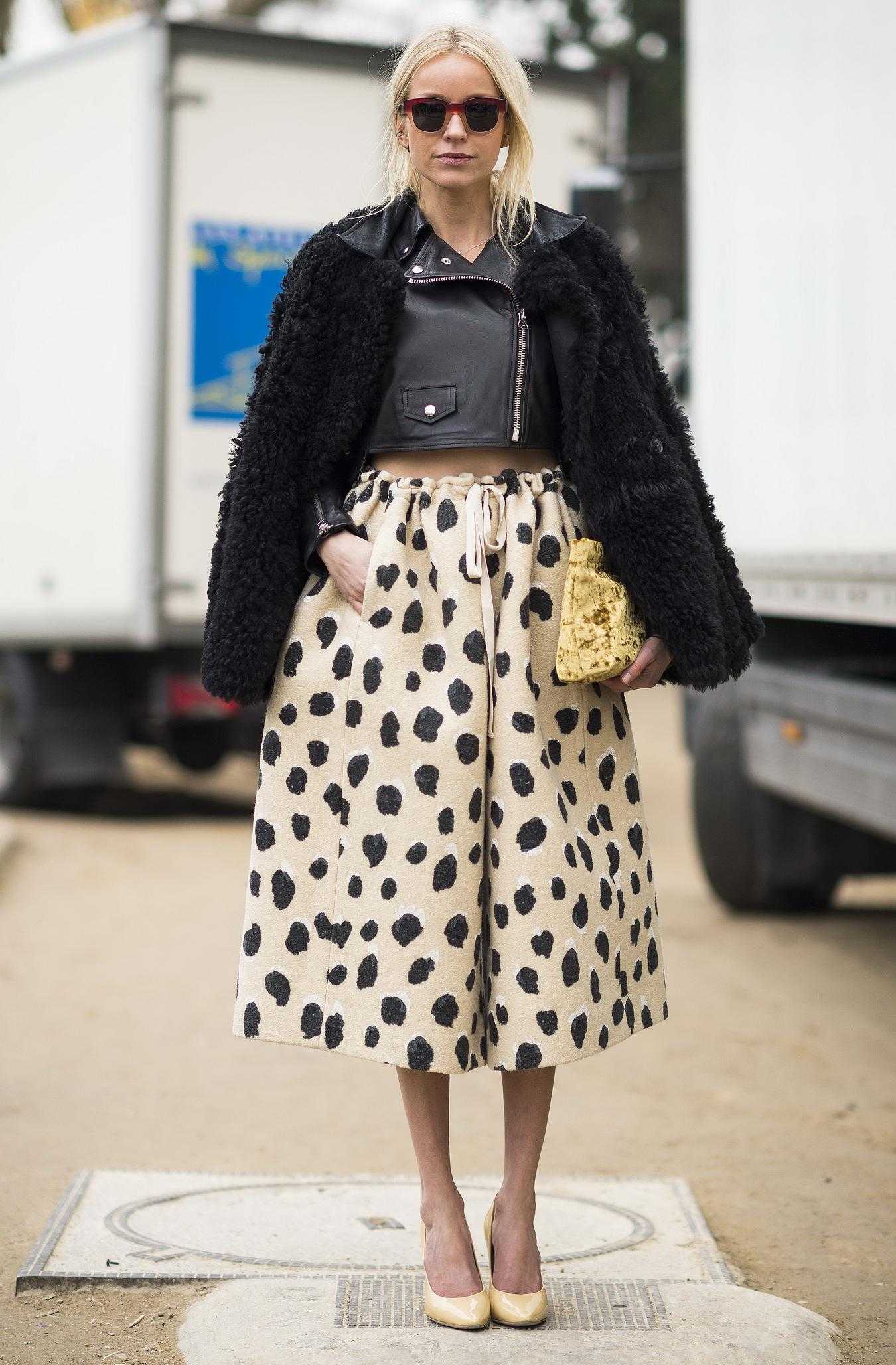 Идеальным вариантом в таком случае будет черная юбка с маленькими белыми горошинками.