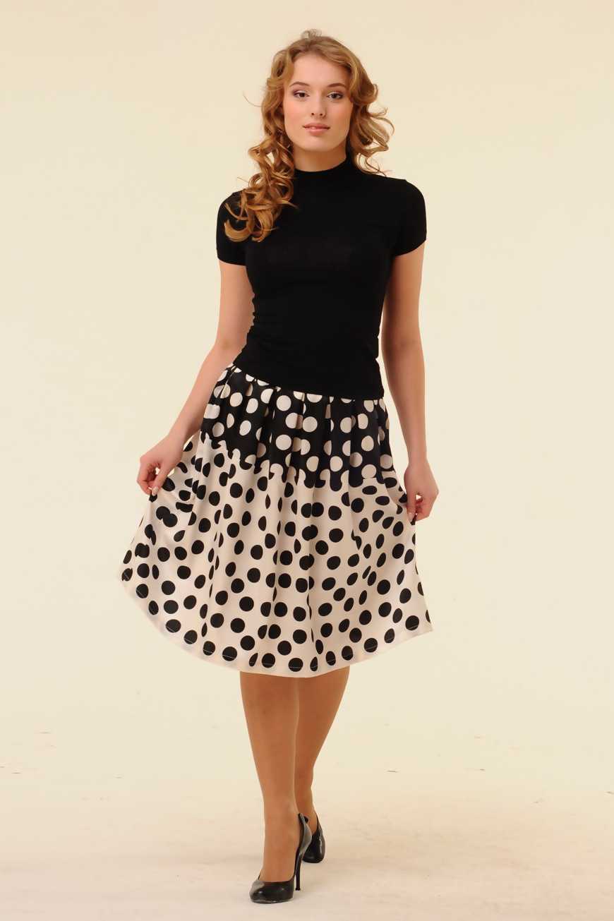 В отношении цветов дизайнеры стремятся экспериментировать, создавая все более интересные и яркие варианты. Классическое сочетание – черная юбка в белый горох. Это популярная модель, которая может быть как с большим, так и с мелким рисунком. Такой вариант уместен для повседневной носки и торжественных событий.