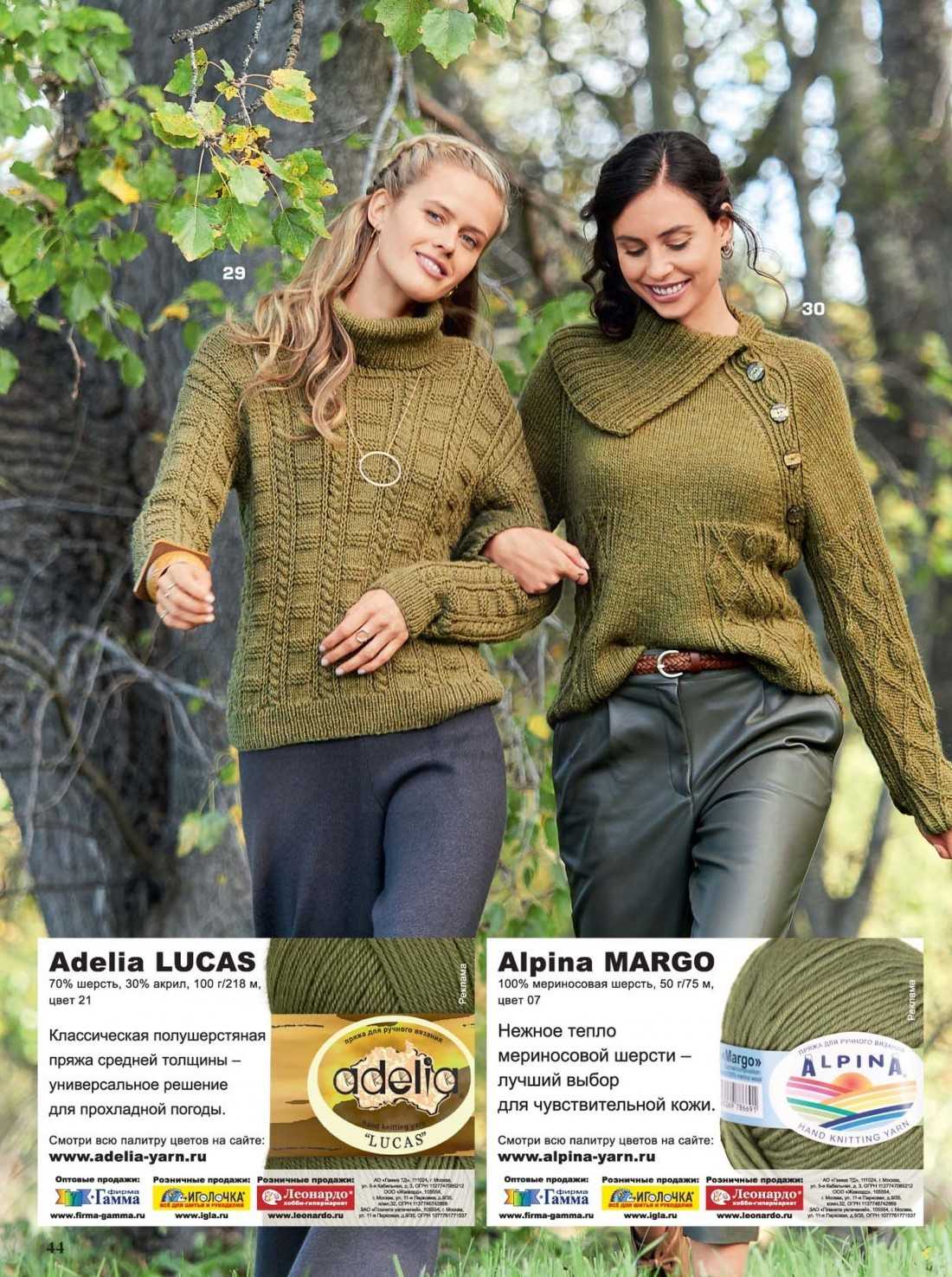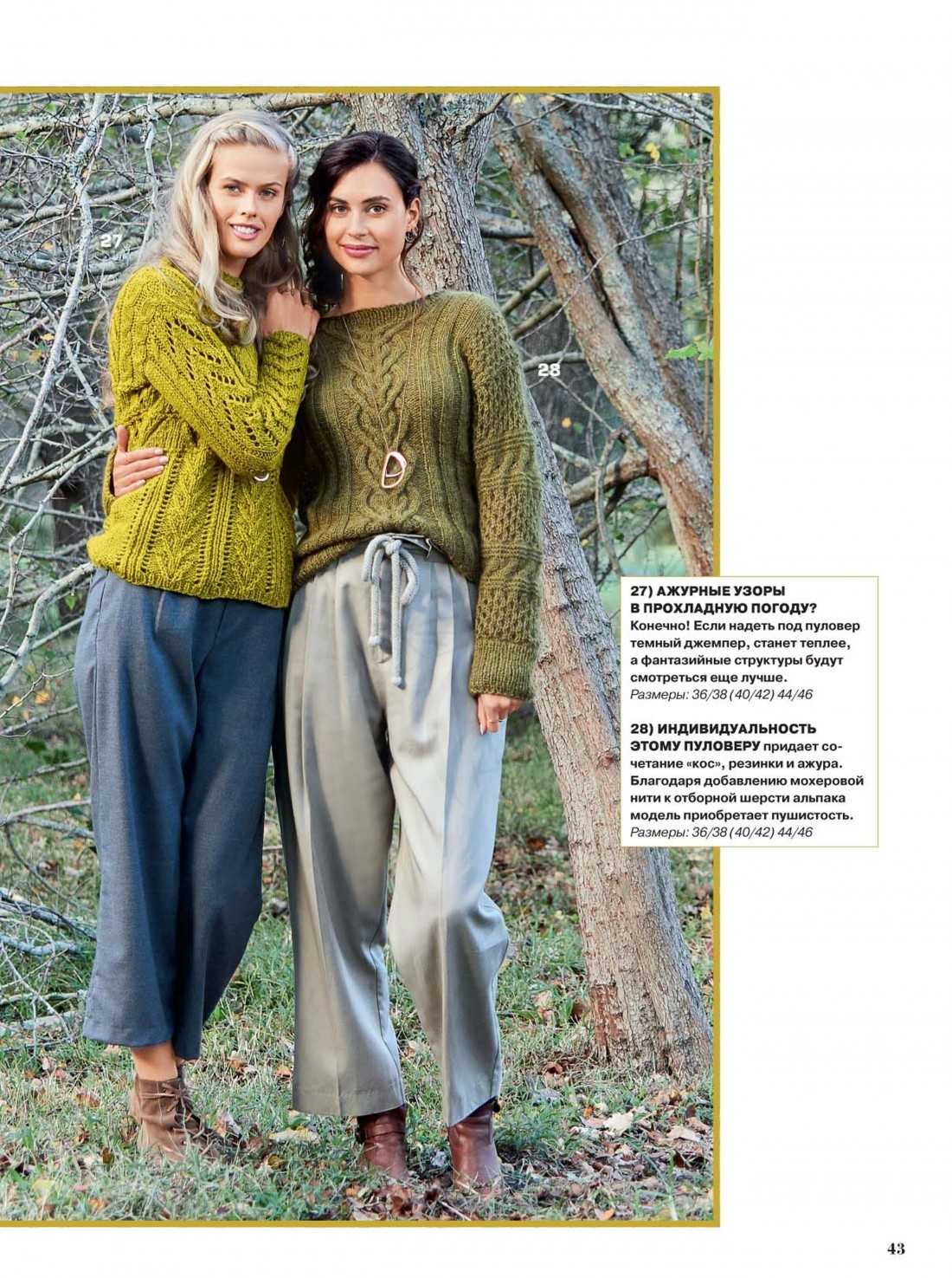 Удлиненный свитер с крупными косами и накладными карманами, красивые ажурные узоры или шикарный теплый пуловер из мохера – в актуальной оливково-шафрановой гамме данные изделия выглядят восхитительно.