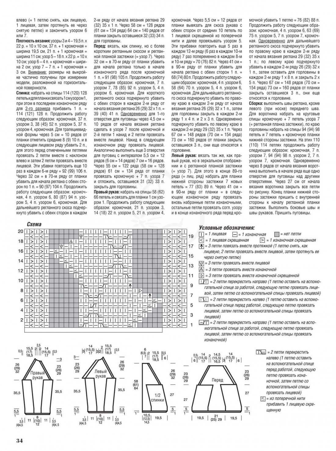 Условные обозначения такие, как в предыдущей схеме. Только перехваты будем выполнять из 6 петелек. То есть снимаем 3п, следующие 3 провязываем, затем переходим к первым трем. Чтобы получить наклон петелек влево, держим дополнительную спицу с петлями перед работой, для наклона вправо – за ней.