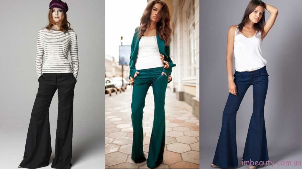 Расклешенные брюки выглядят очень женственно. Они позволяют придать привлекательные формы даже девушкам с худым мальчиковым телосложением. Также подобные модели хорошо смотрятся на обладательницах фигуры «песочные часы». При этом модницам с полными бедрами лучше отказаться от такого фасона, поскольку он делает нижнюю часть более объемной.