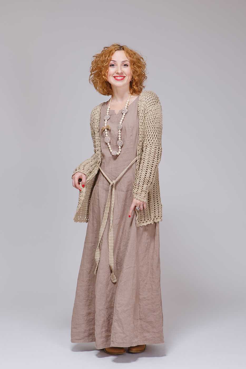 - Лен и кружево. Причем речь идет о грубоватом кружеве – ручном или имитирующем ручное. Например, из такого кружева может быть сделана отделка на юбке. Либо же кружевная или тонкая ажурная вязаная вещь станет дополнением к льняной: к примеру, поверх льняного сарафана может быть надета ажурная летняя кофточка.
