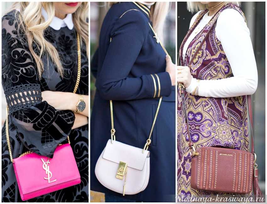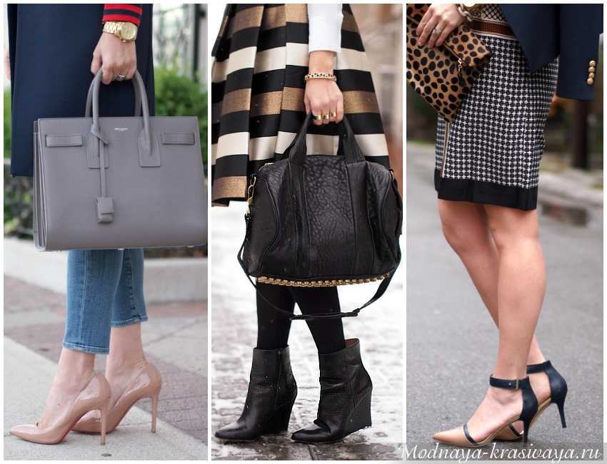 Сумка не должна быть громоздкой или совсем миниатюрной. Лучше отдать предпочтение среднему размеру геометрической формы и носить ее на длинном ремне. Прекрасно, если сумка гармонирует, но не совпадает по цвету с обувью.