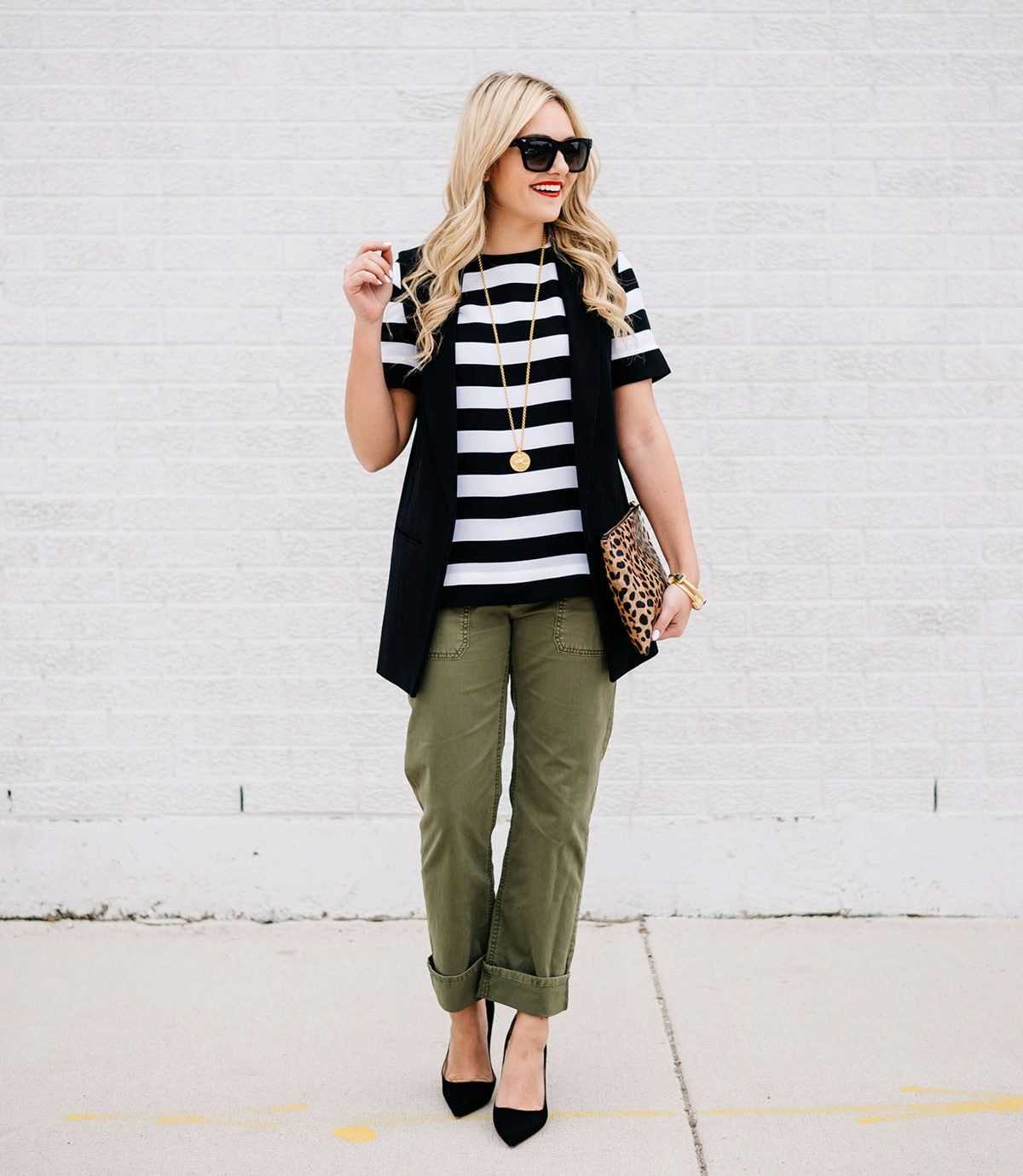 Чиносы носят с удлиненными классическими блузками. С черным верхом сочетается зеленый низ или цвета хаки. Камуфляжные брюки комбинируйте с темными однотонными вещами. Обувь должна быть простой. Подойдут пантолеты, босоножки на плоской подошве или кроссовки.