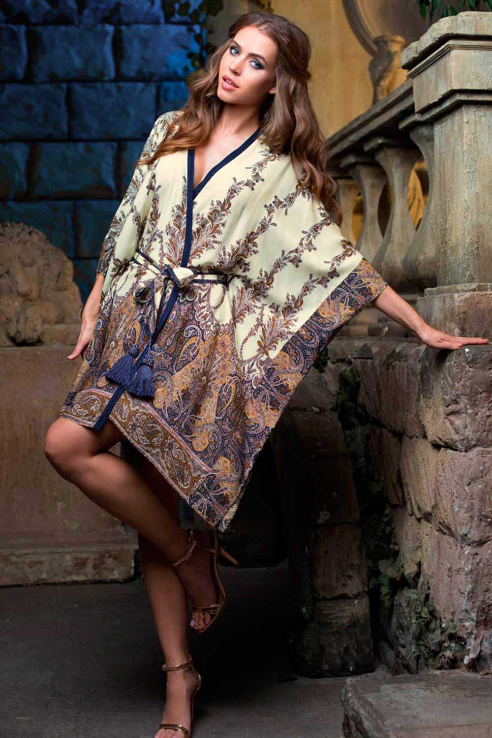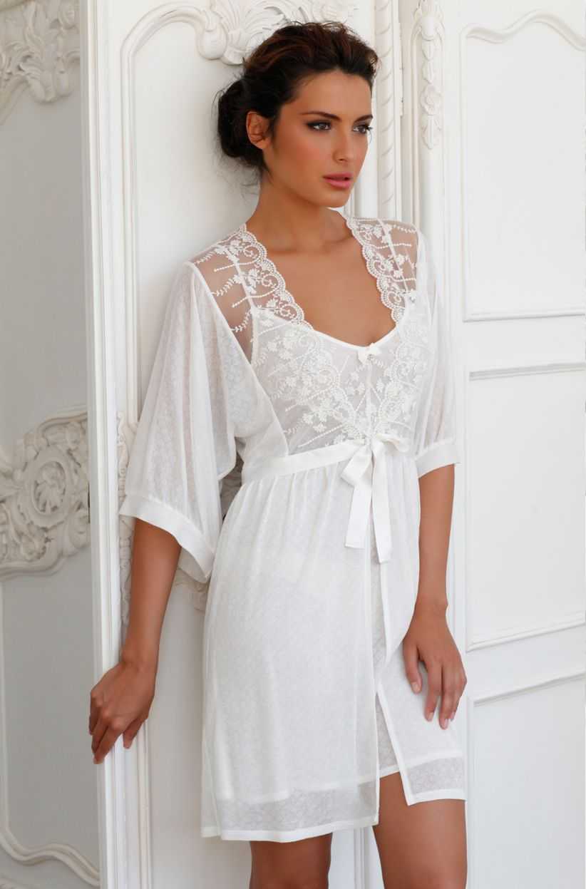 4. Фасон кимоно. Напоминает традиционное японское кимоно, но более домашнего стиля, украшенное рюшами, оборками, гипюром. Под этот тип можно отнести все лёгкие и декорированные запахивающиеся халаты с поясом. Они могут быть как в пол, так и короткими.