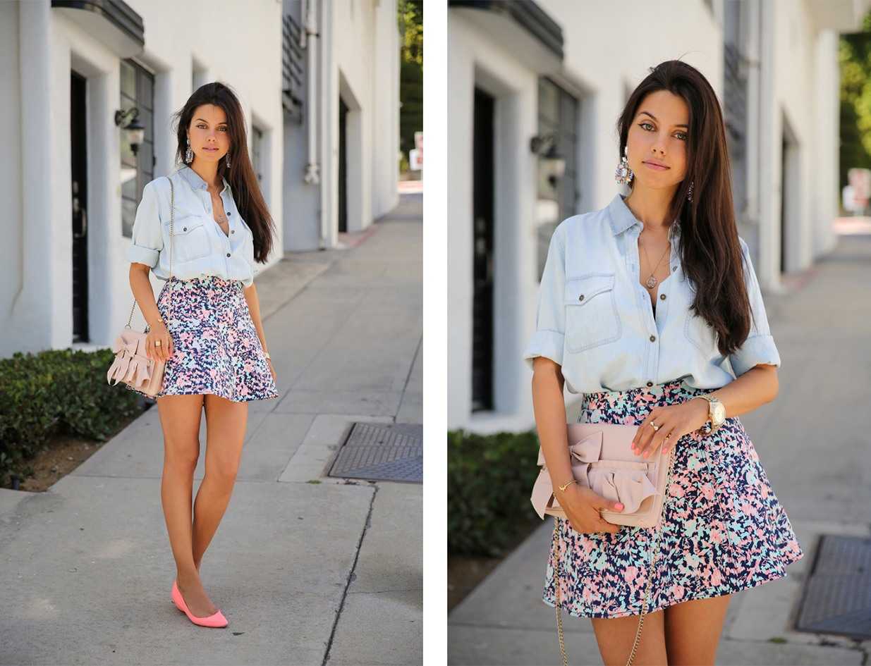 - Брюки чинос темно-синего цвета, белая рубашка с цветочным принтом или же красная блузка.