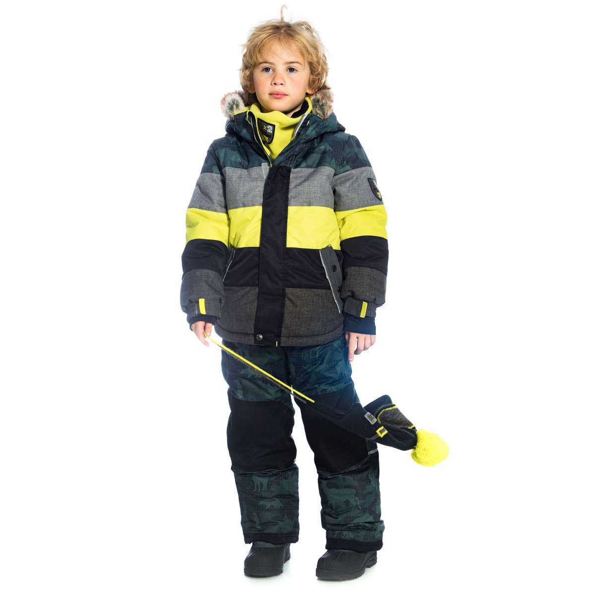 Стильный костюм для мальчика. На куртке два прорезных кармана, а также на левом рукаве кармашек для мелочей. На манжетах имеются липучки — утяжки. Также у куртки есть внутренняя защита от продувания. Мех на капюшоне можно отстегнуть. Полукомбинезон имеет усиление на коленях и ягодицах. Пояс можно регулировать по ширине, лямки можно отстегнуть.